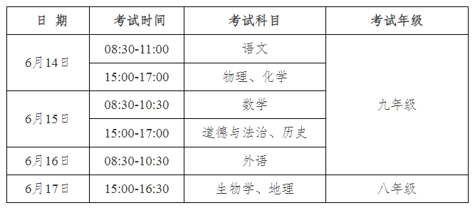 语文、数学、外语、物理、化学实行纸笔闭卷考试,语文考试允许使用正版学生字典;道德与法治、历史实行纸笔开卷考试,允许携带教科书等相关资料。生物学、地理实行纸笔闭卷考试。各学科考试均不允许使用计算器。